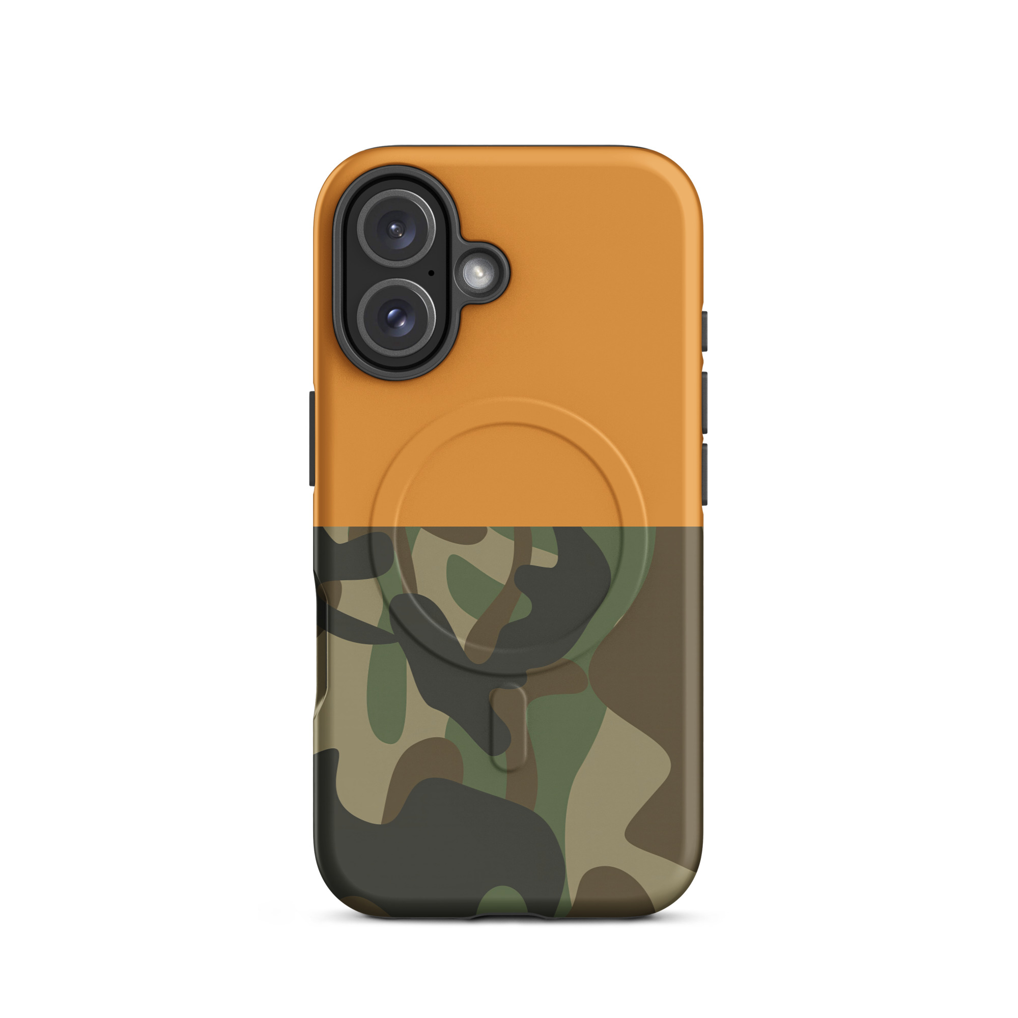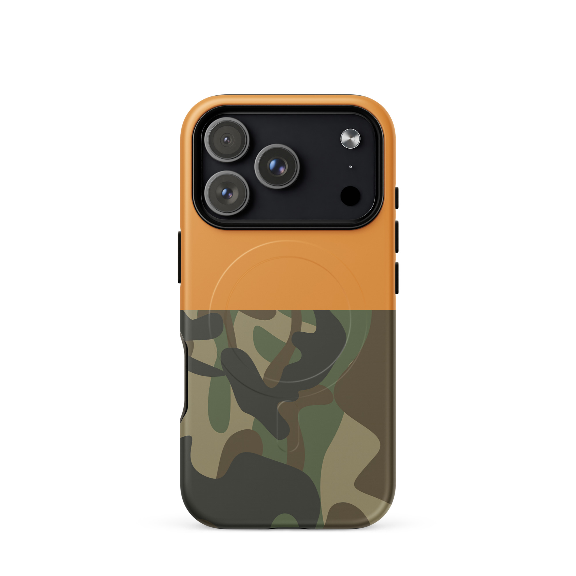 Protect your phone with this tough, dual-layer Half And Half Cosmic Orange Camo MagSafe Phone Case. Its impact-resistant shell and shock-absorbing liner keep your device safe, while built-in MagSafe® magnets ensure secure attachment and faster wireless charging. **The Cosmic Orange color is an approximatrion to Apple’s. We don’t have an actual color code for a prefect match.