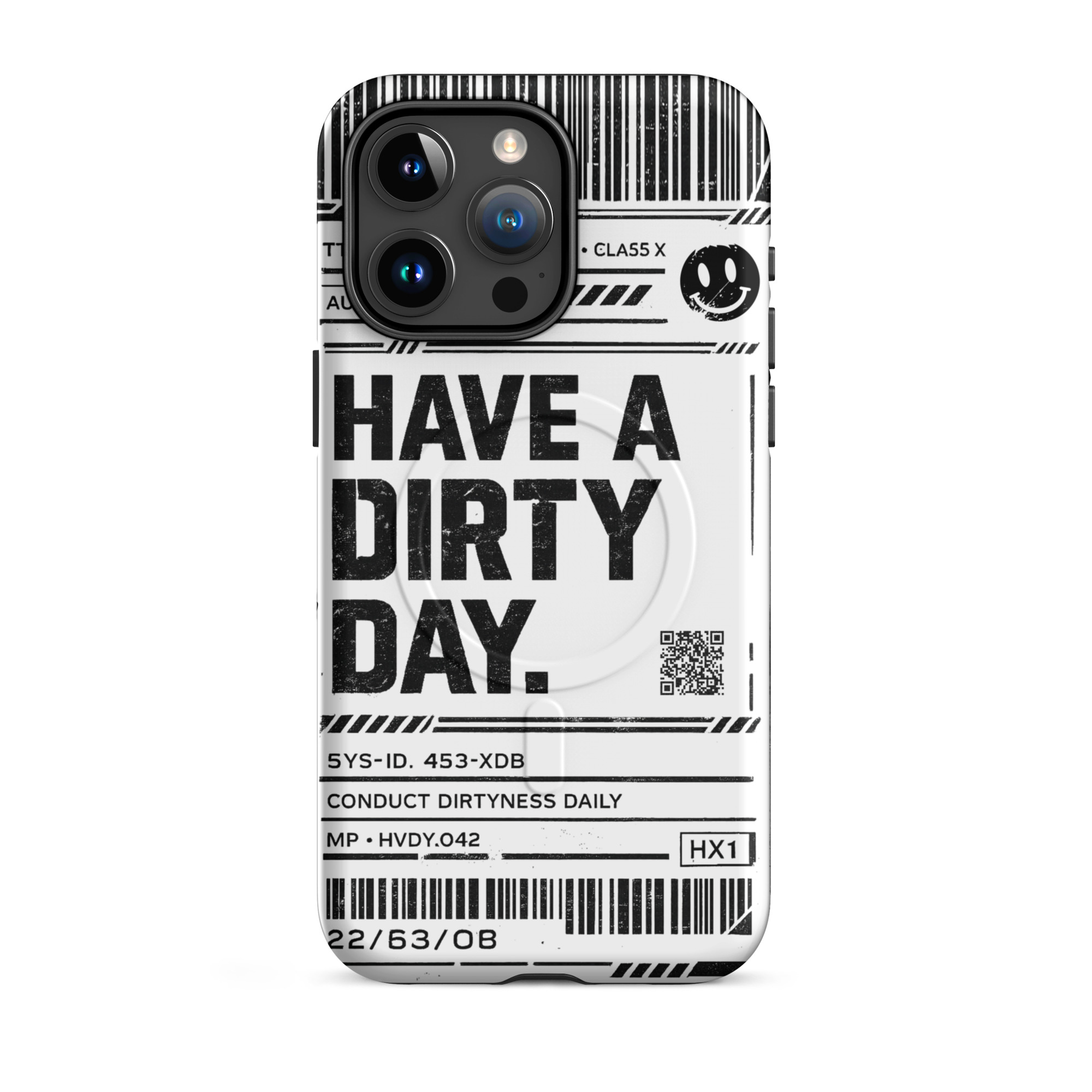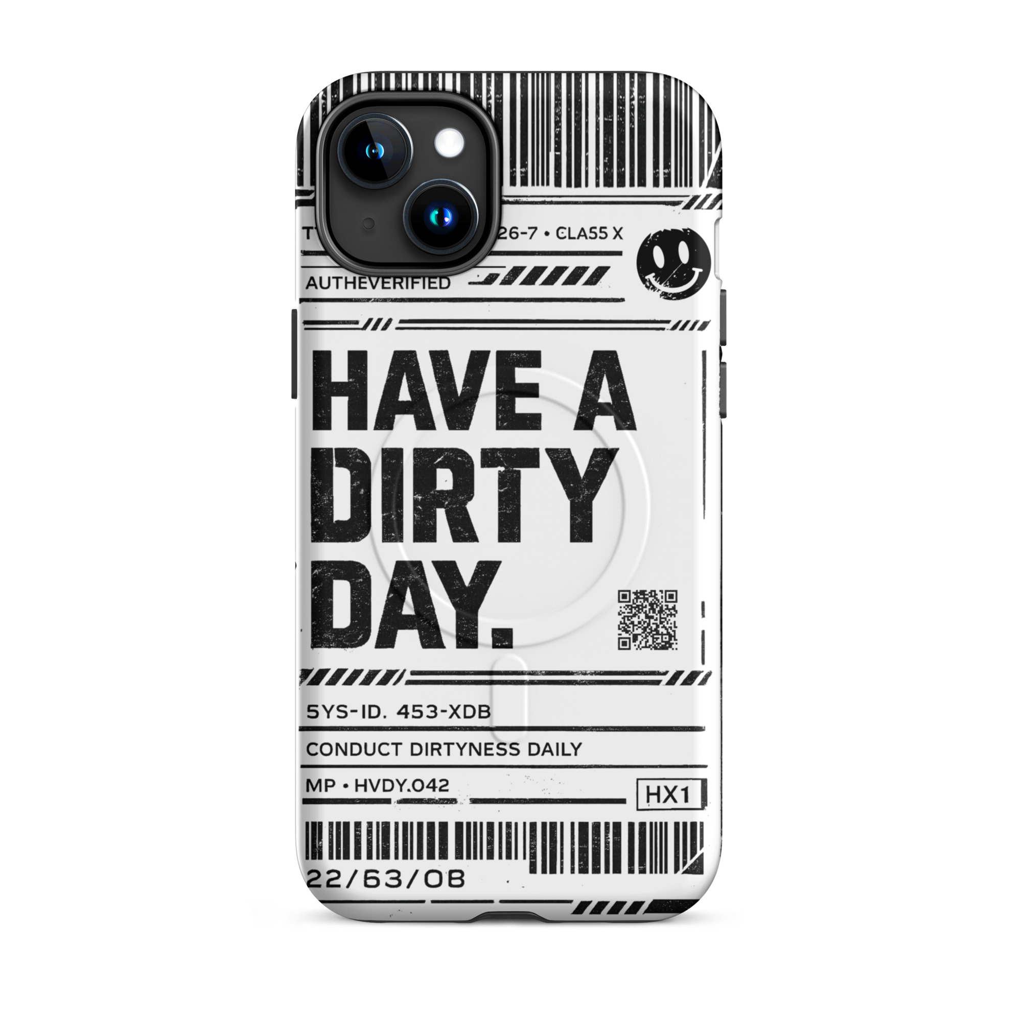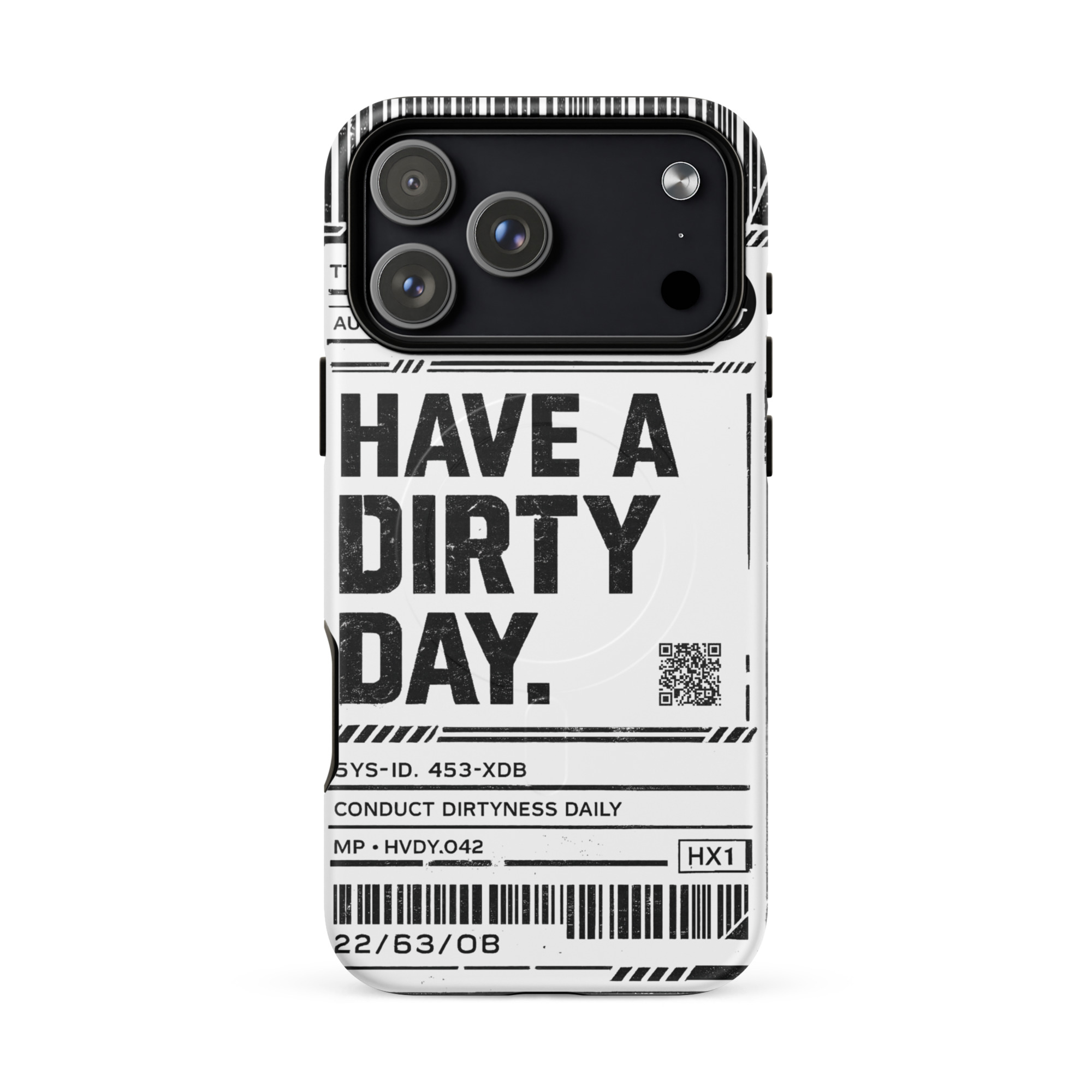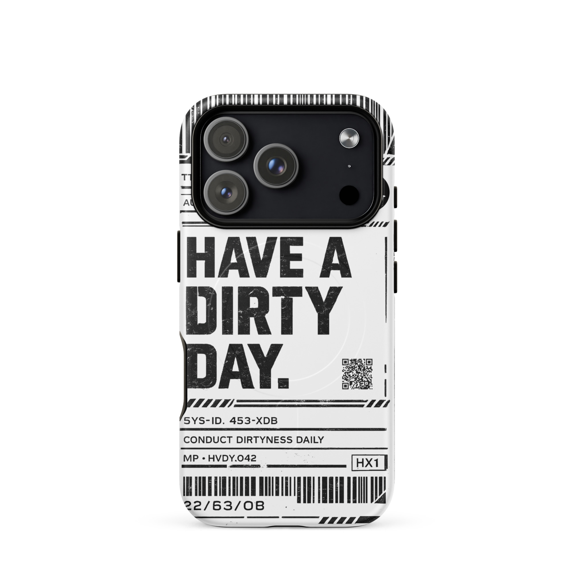 The HAVE A DIRTY DAY case isn’t just protection — it’s an industrial statement. The design feels like a factory mark, a coded label, something issued rather than purchased. Stark typography. Utility aesthetics. No fluff.