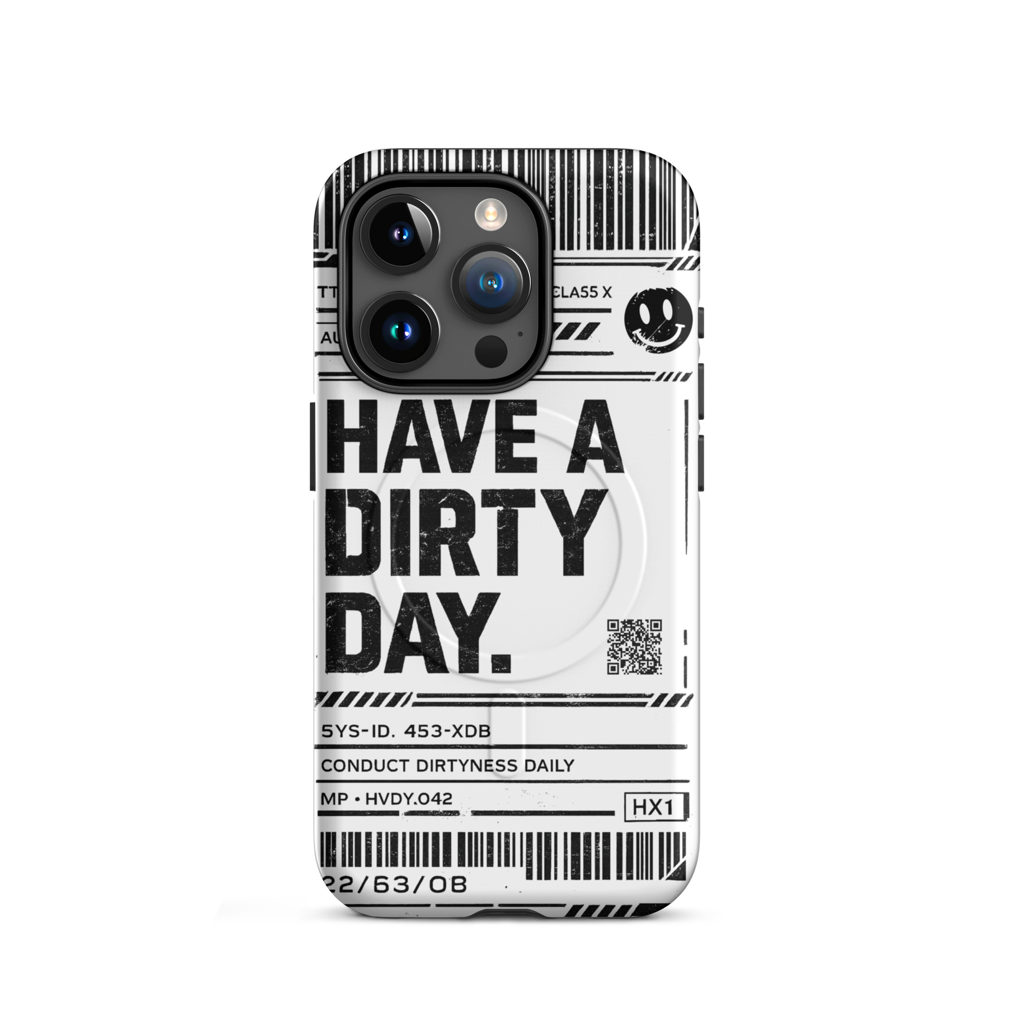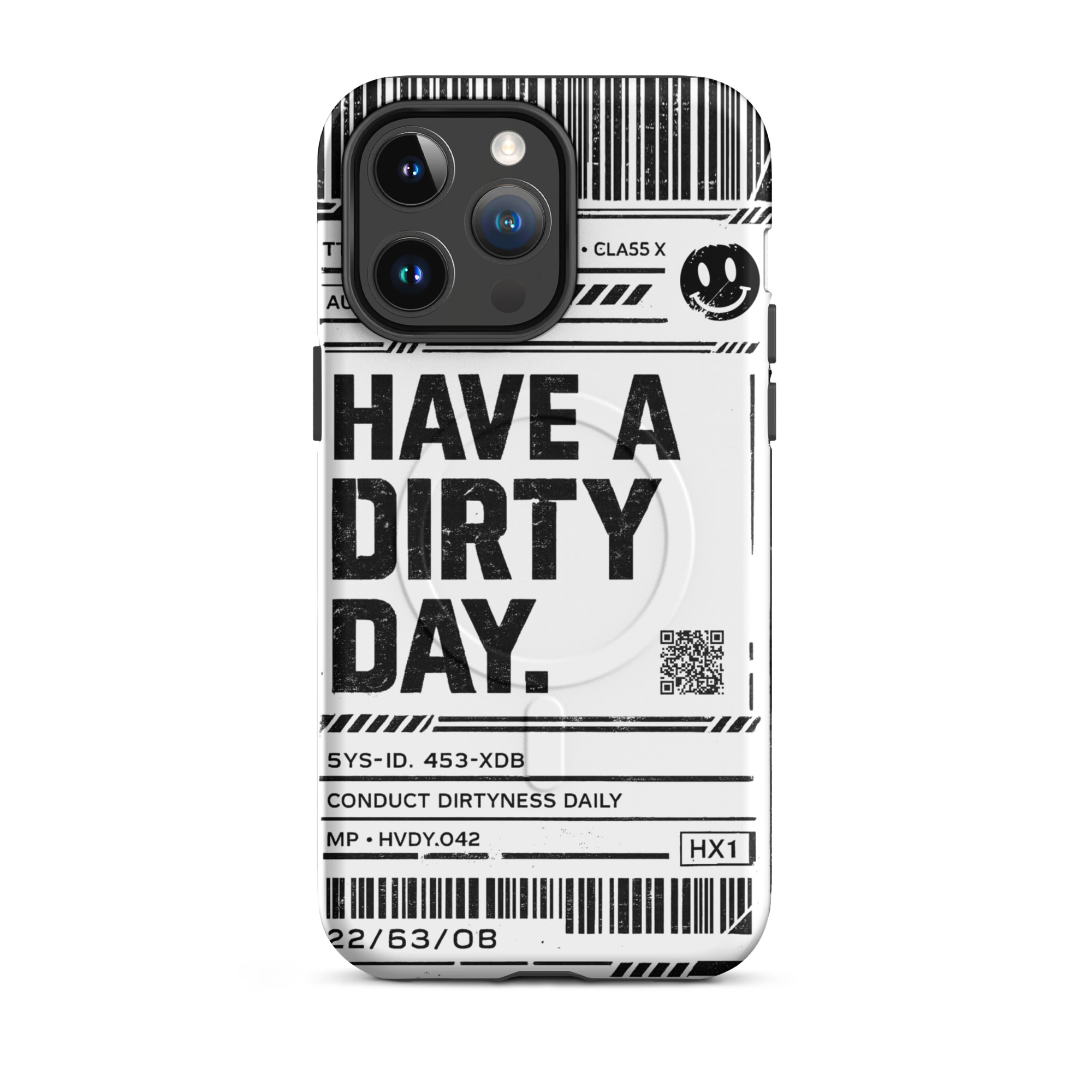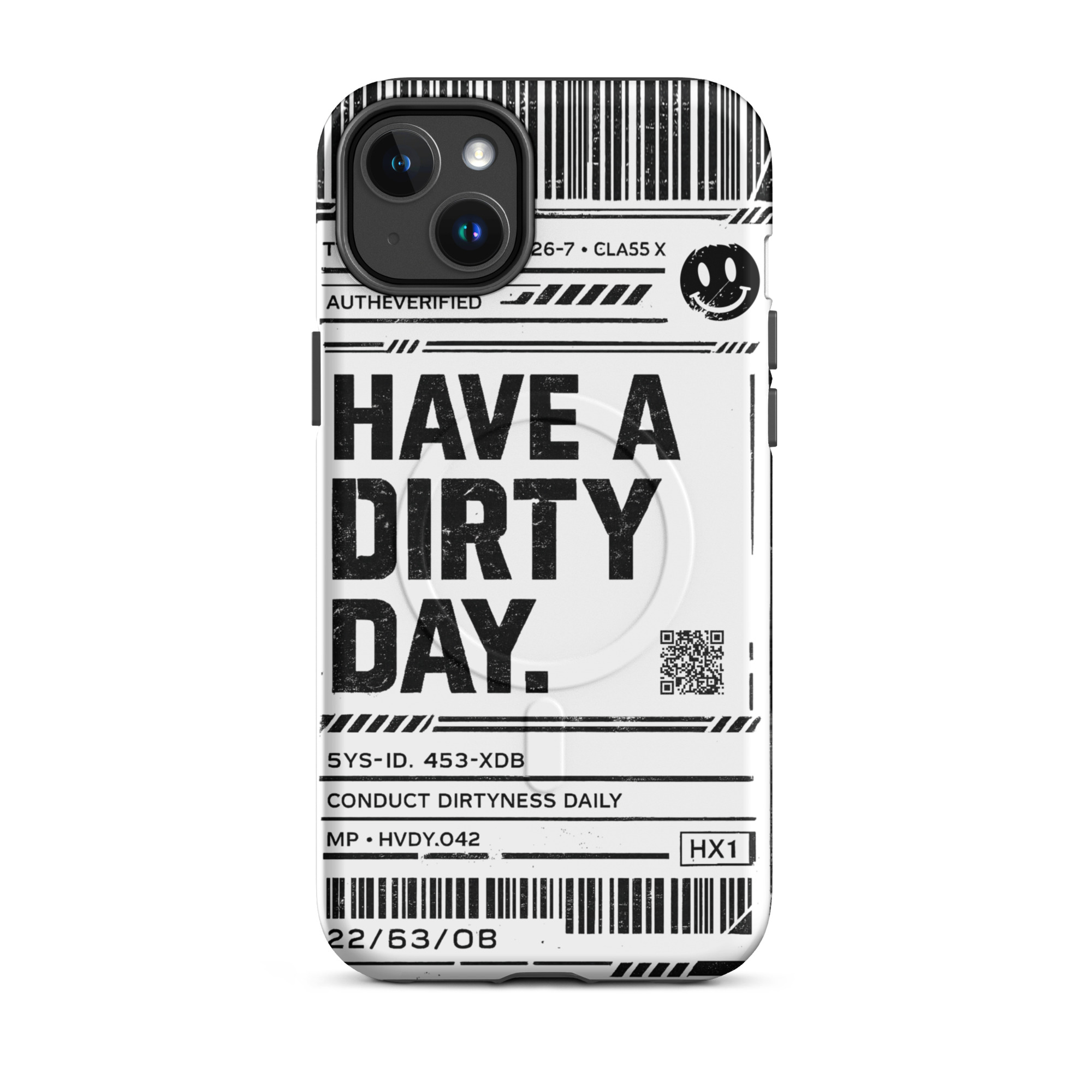 The HAVE A DIRTY DAY case isn’t just protection — it’s an industrial statement. The design feels like a factory mark, a coded label, something issued rather than purchased. Stark typography. Utility aesthetics. No fluff.