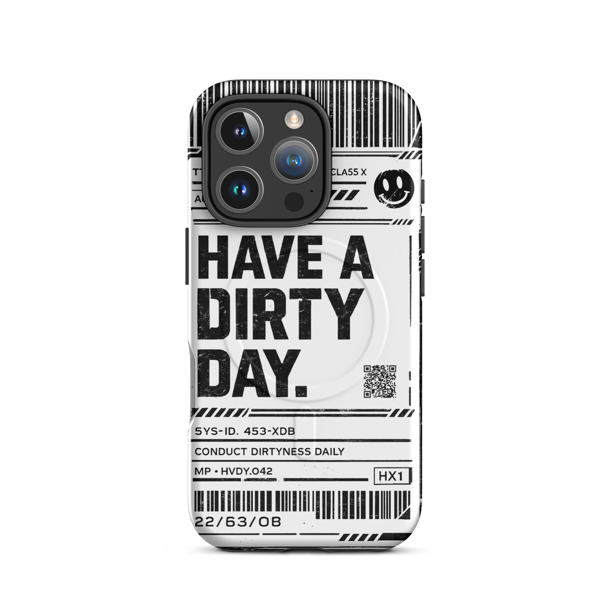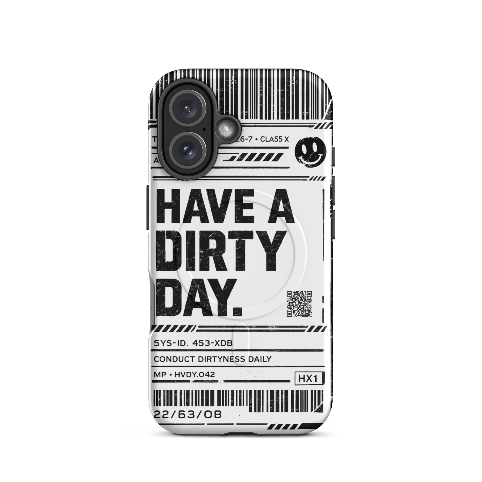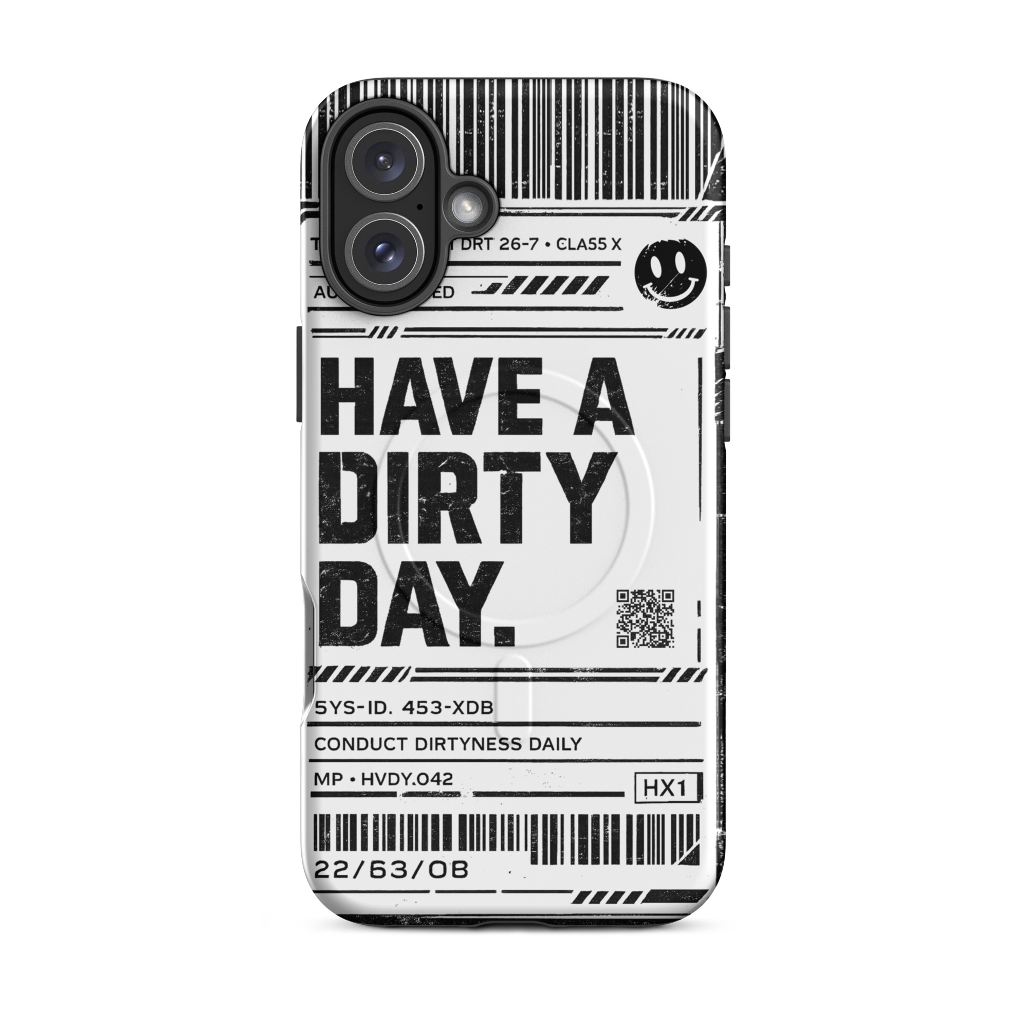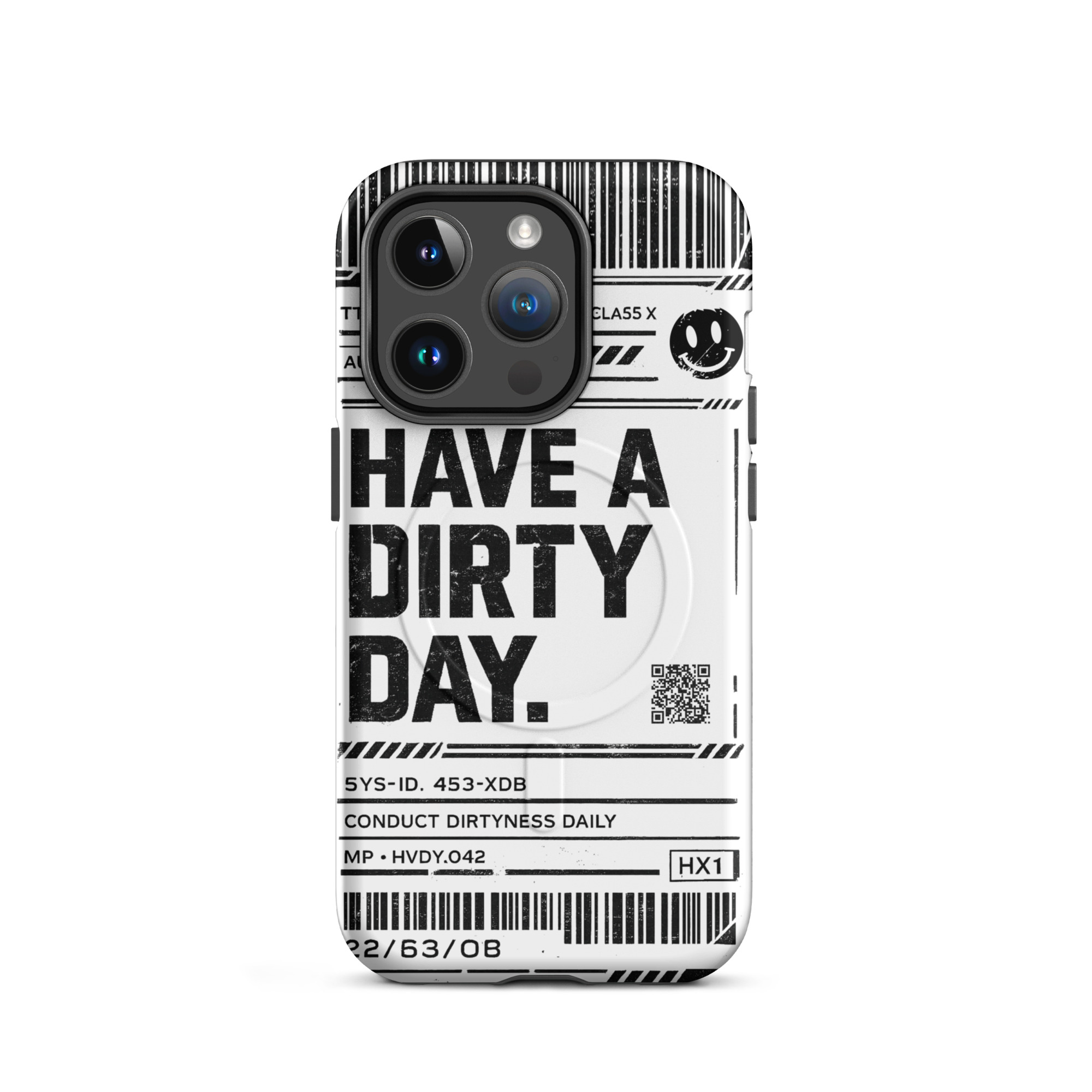 The HAVE A DIRTY DAY case isn’t just protection — it’s an industrial statement. The design feels like a factory mark, a coded label, something issued rather than purchased. Stark typography. Utility aesthetics. No fluff.